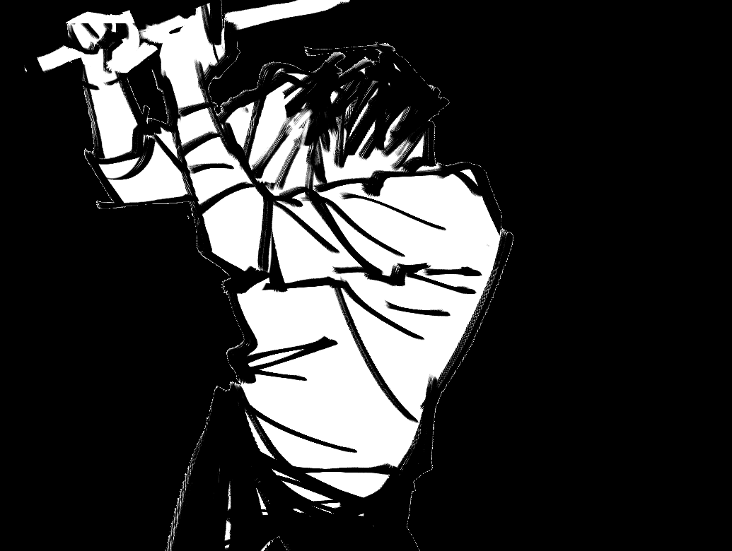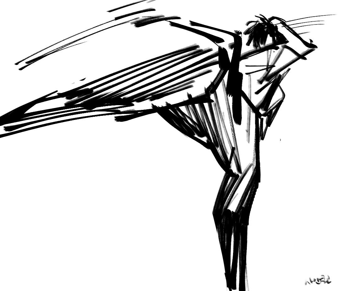 (이럴때야말로 사람을 만나며 익혀둔 예술에 대한 정보와 미적감각을 뽐낼때다..! 라고 생각하며 그림을 보자마자 그 기대가 보기좋게 배신당해 움찔거린다. 와, 전혀모르겠네) 음.... 이, 검고..거침없이 그려진 획들... (사뭇 진지한 척을 해보이며 시원한 웃음을 지은 뒤 네쪽으로 찡긋, 눈짓해보인다) 이 수많은 사람들 중에 우리의 만남을 축하하는 그림이 아닐까요? (깜깜한데도?)