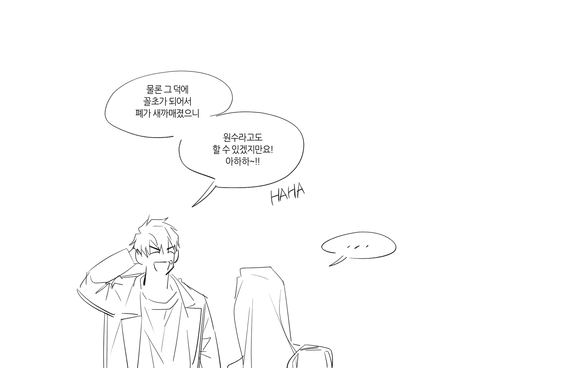 동시에 날 구하기도 했죠. ... 아, 표정봐. 괜찮아요? (네 표정을 보면서 눈을 두어번 껌뻑이더니 그대로 시원하게 웃어버린다) 너무 심각한 표정 아니에요? 그렇게 놀랄필요는 없는데! 음, 어떻게 보면 그 담배는 내 인생을 망침과 동시에 구한거죠! 내가 가장 힘들때 그 담배가 힘이됐거든요. 덕분에 폐는 새까매졌지만!